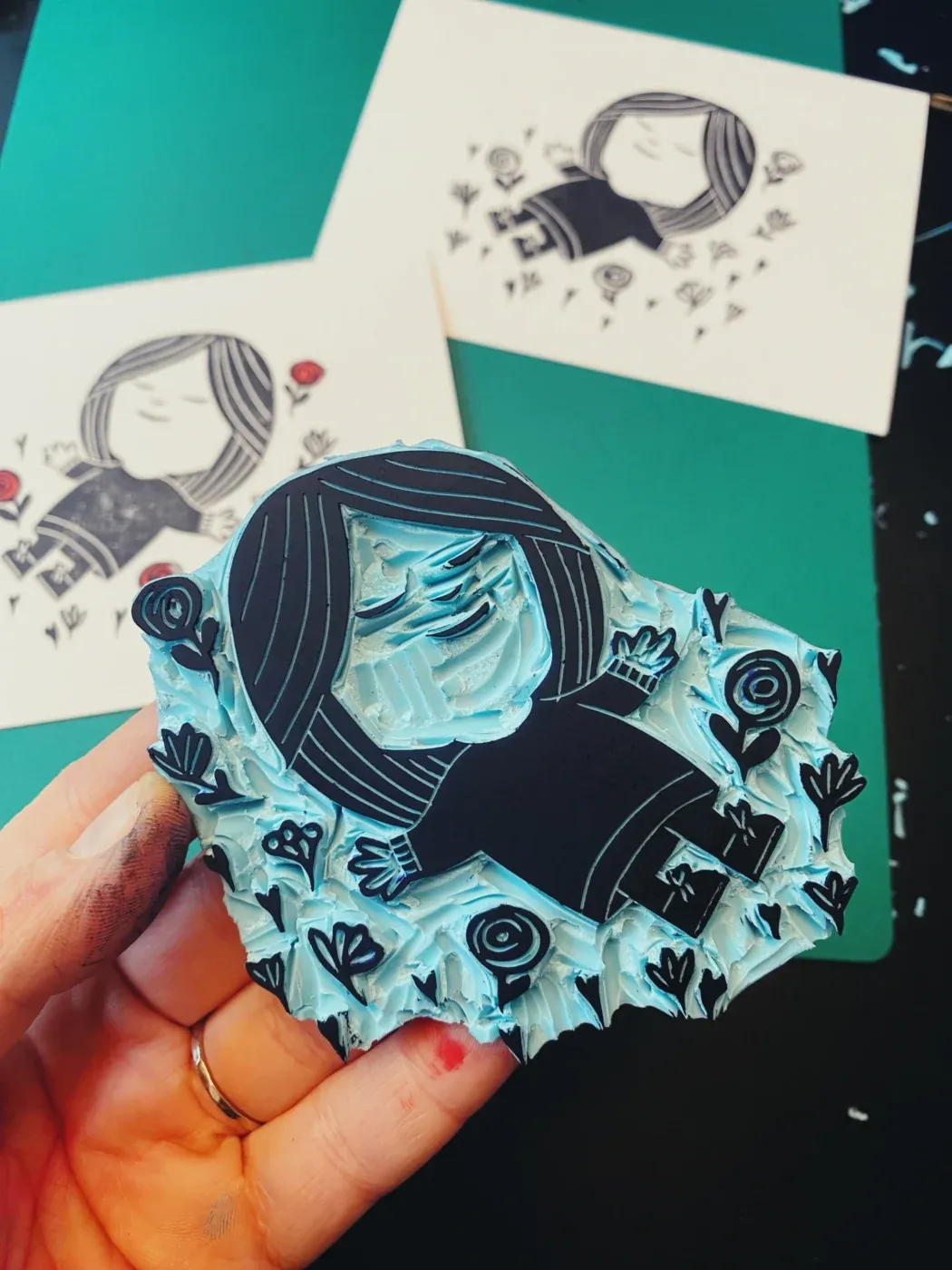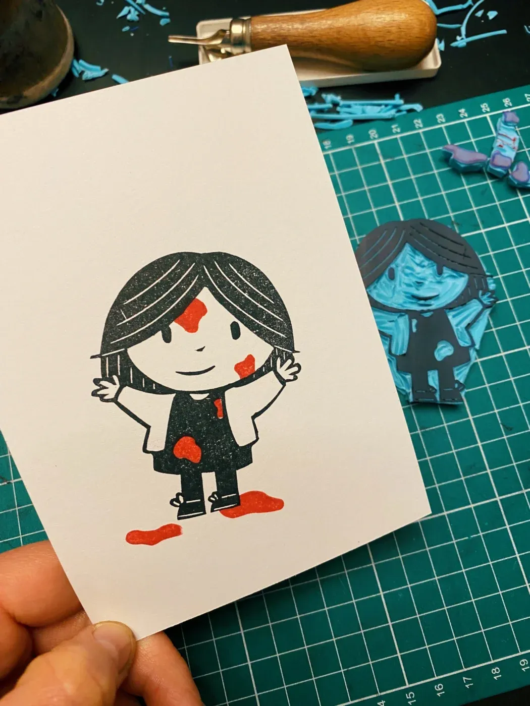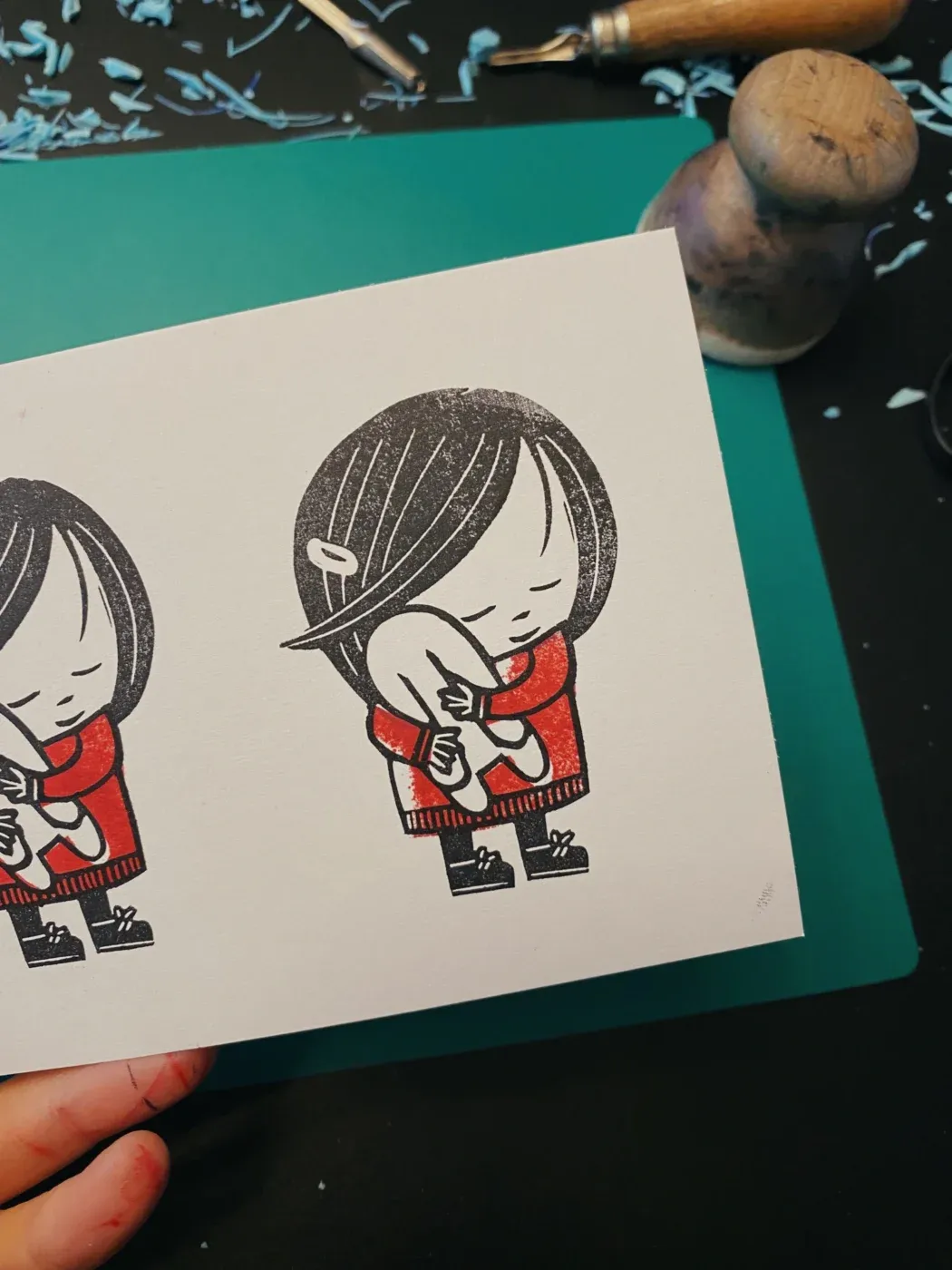 This is what she looks like when we've just painted : D Real artists mess around a bit, don't they... I'm not 100% happy with the print, so I already know I will have to give this one another try.