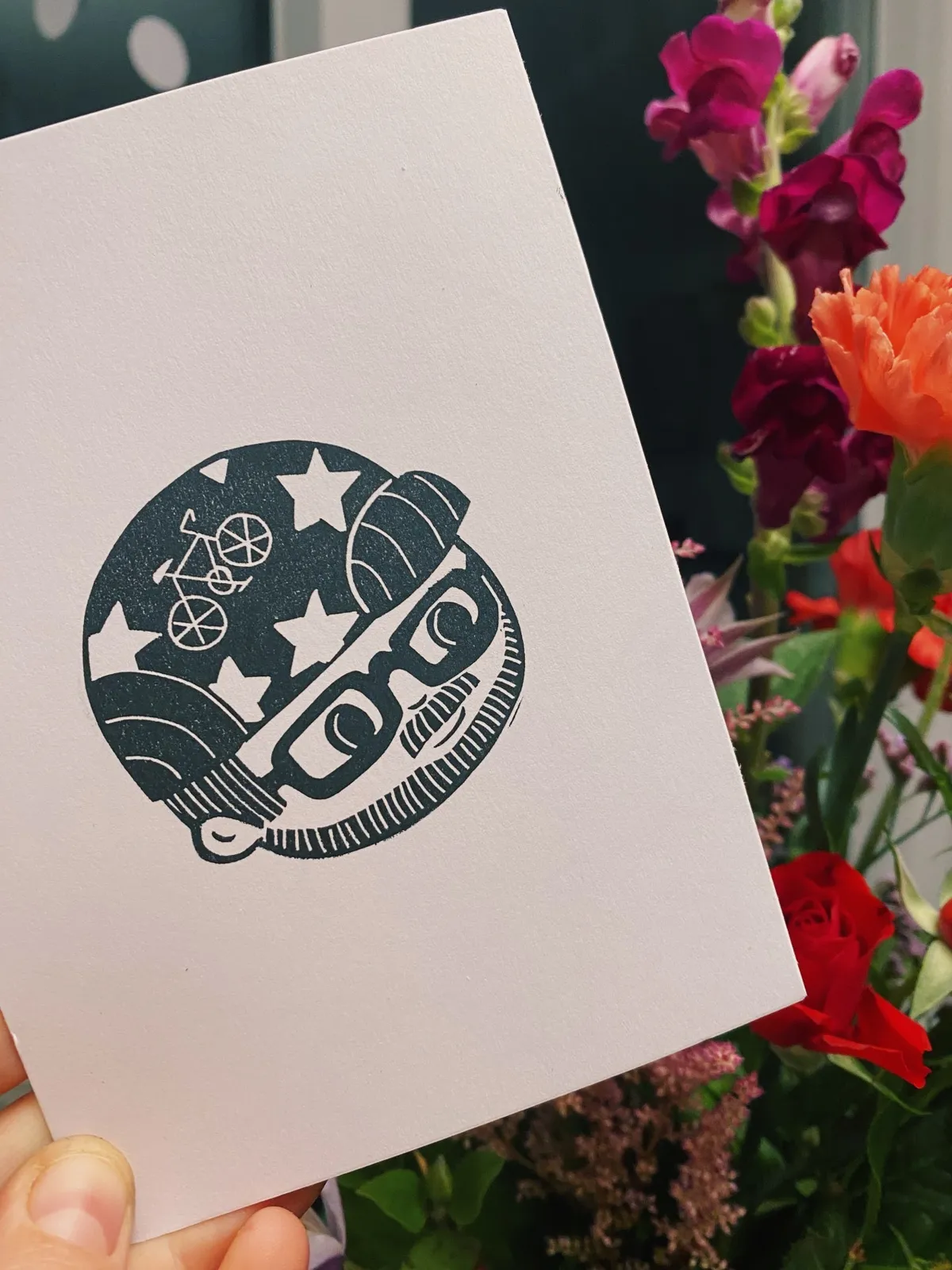 This year, I wanted to make something myself. And it all started with this print. My husband trains for marathons and triathlons every year, so I regularly see him wearing his cycling cap. I thought it would be fun to immortalize his triathlon career like this.