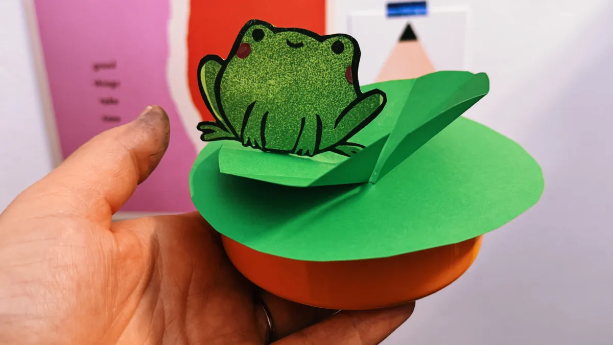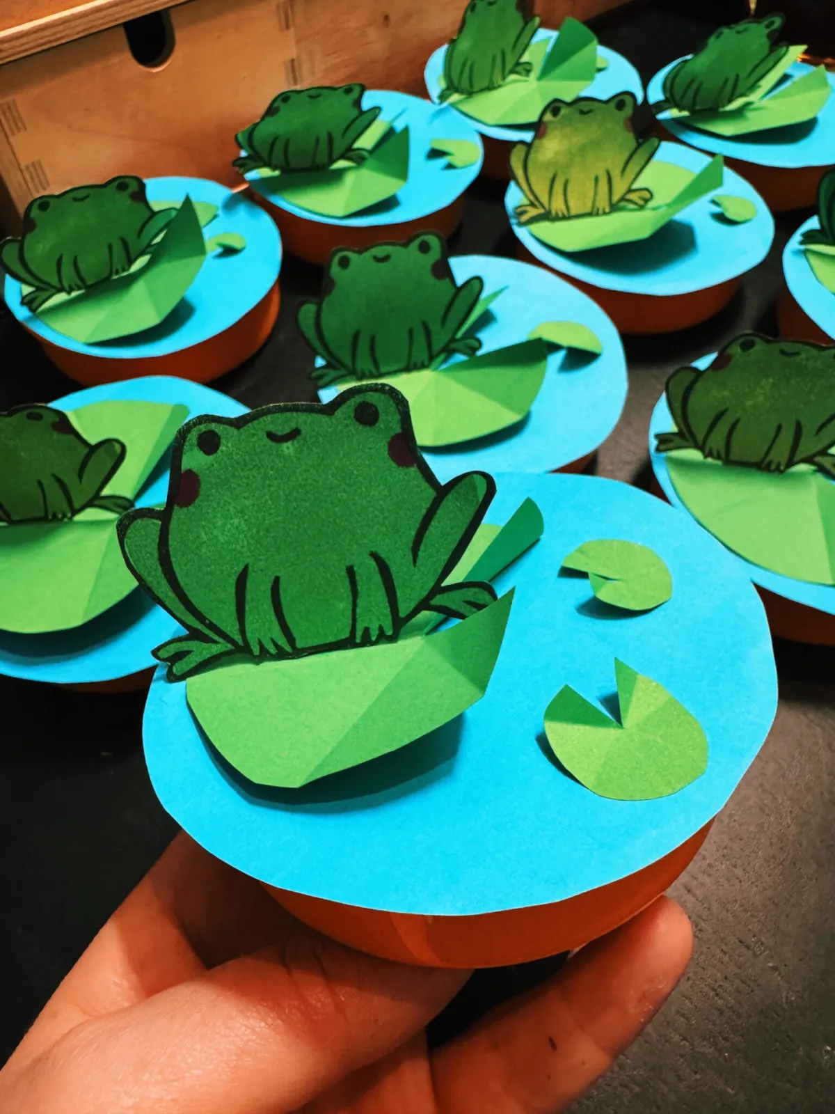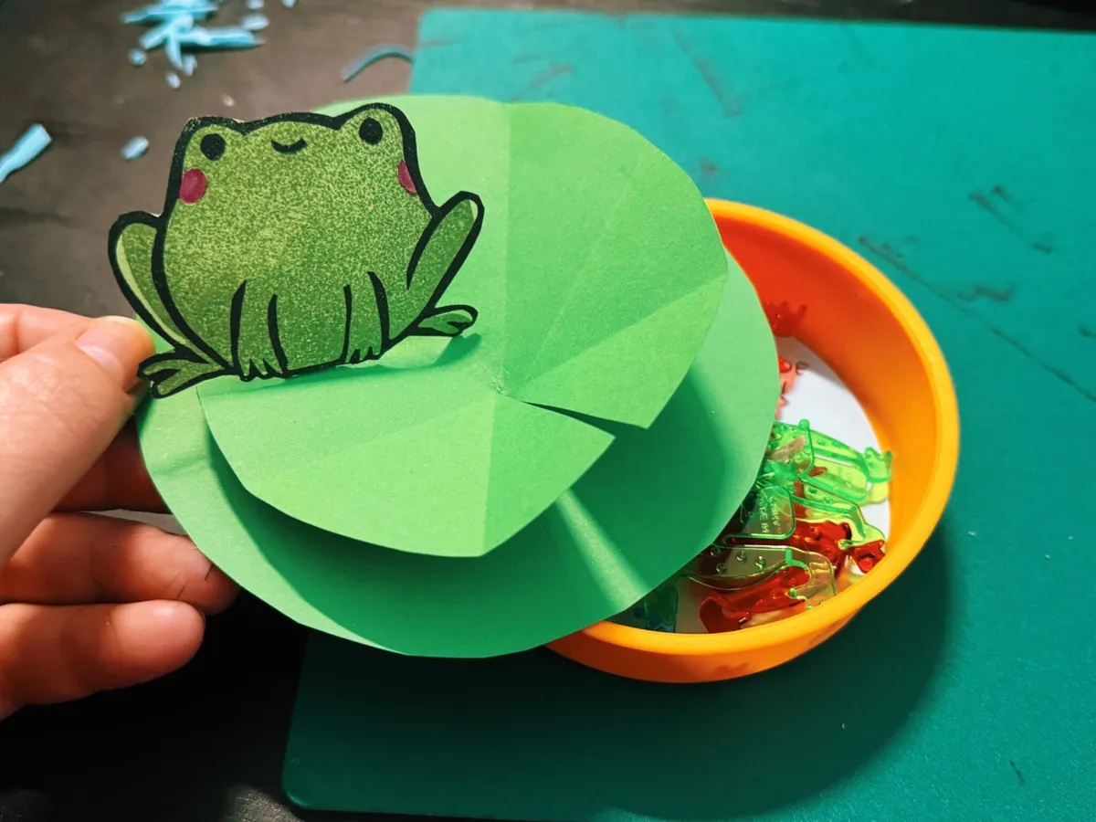 I made a linocut of a frog and printed it. And then turned the container into a pond. This is what the first prototype looked like.