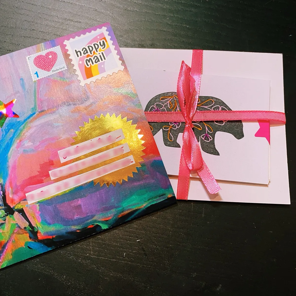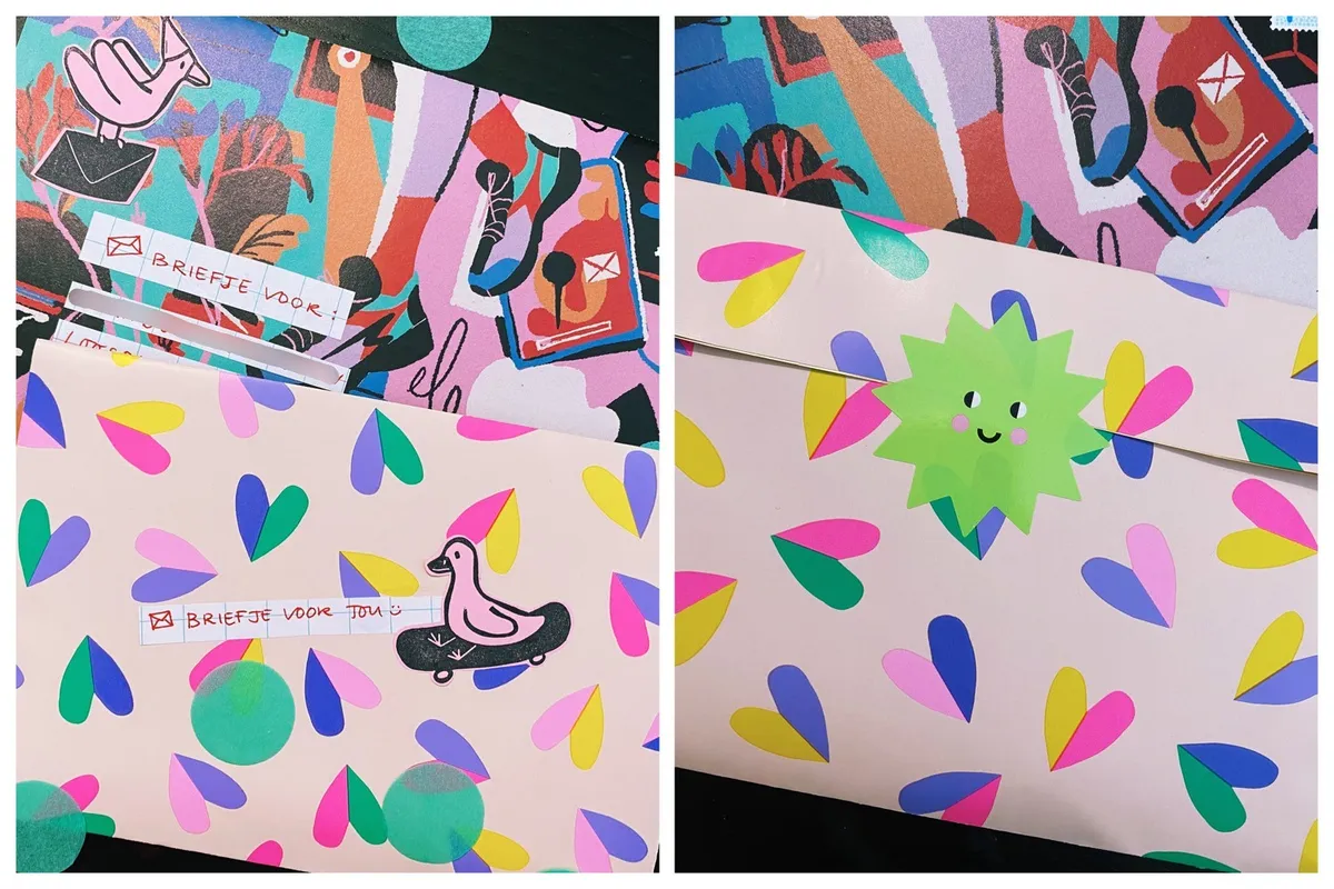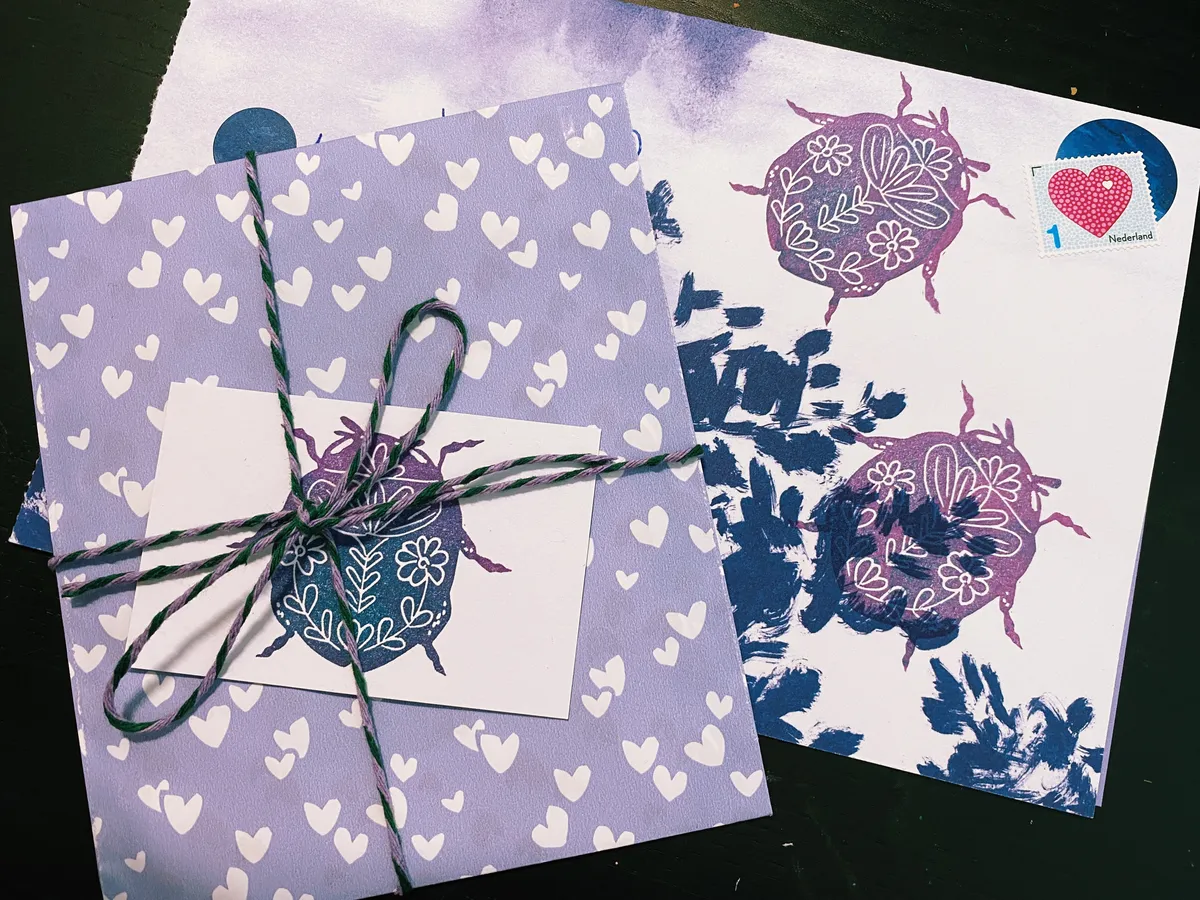 I also made some stamps this month. I am very happy to report that my creativity has returned! For Lonneke I made this surprise package. I enjoy it so much when I have just the right color of string and gift bag to finish it off 💜