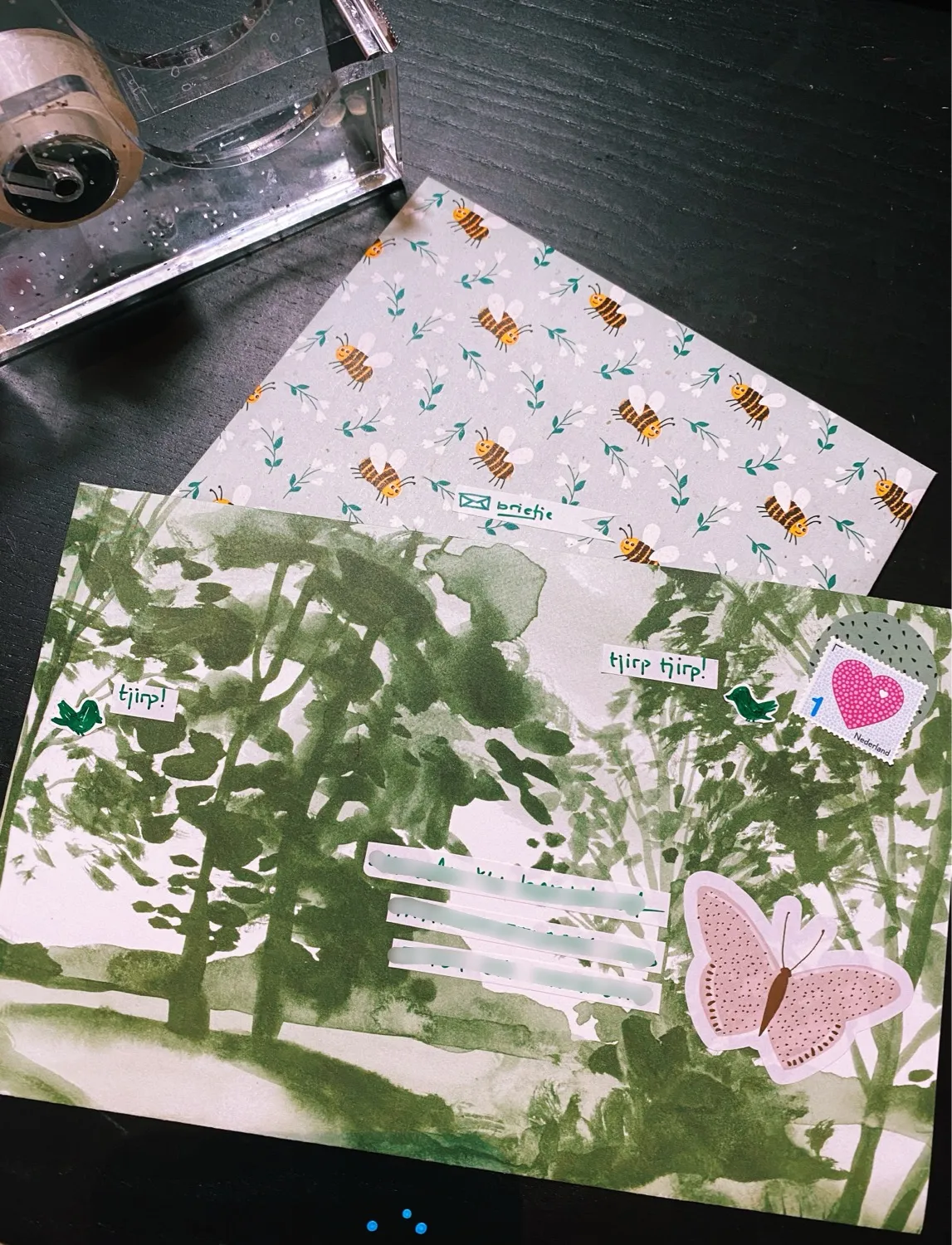 I stayed in spring theme for my letter to Malu. Green spring mail with chirping birds.