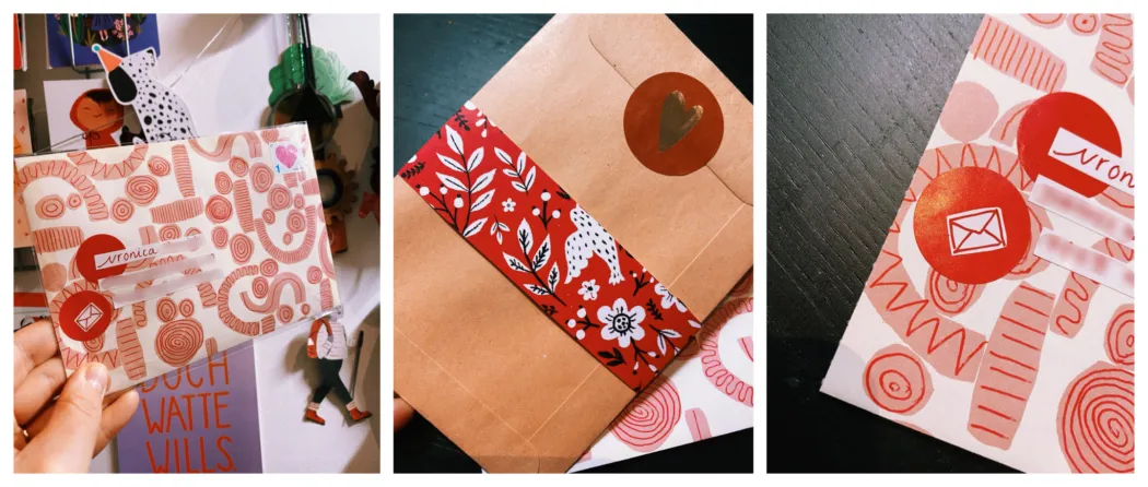 Red themed mail for Vronica. The red band around the envelope is made out of paper from illustrator Dinara Mirtalipova.