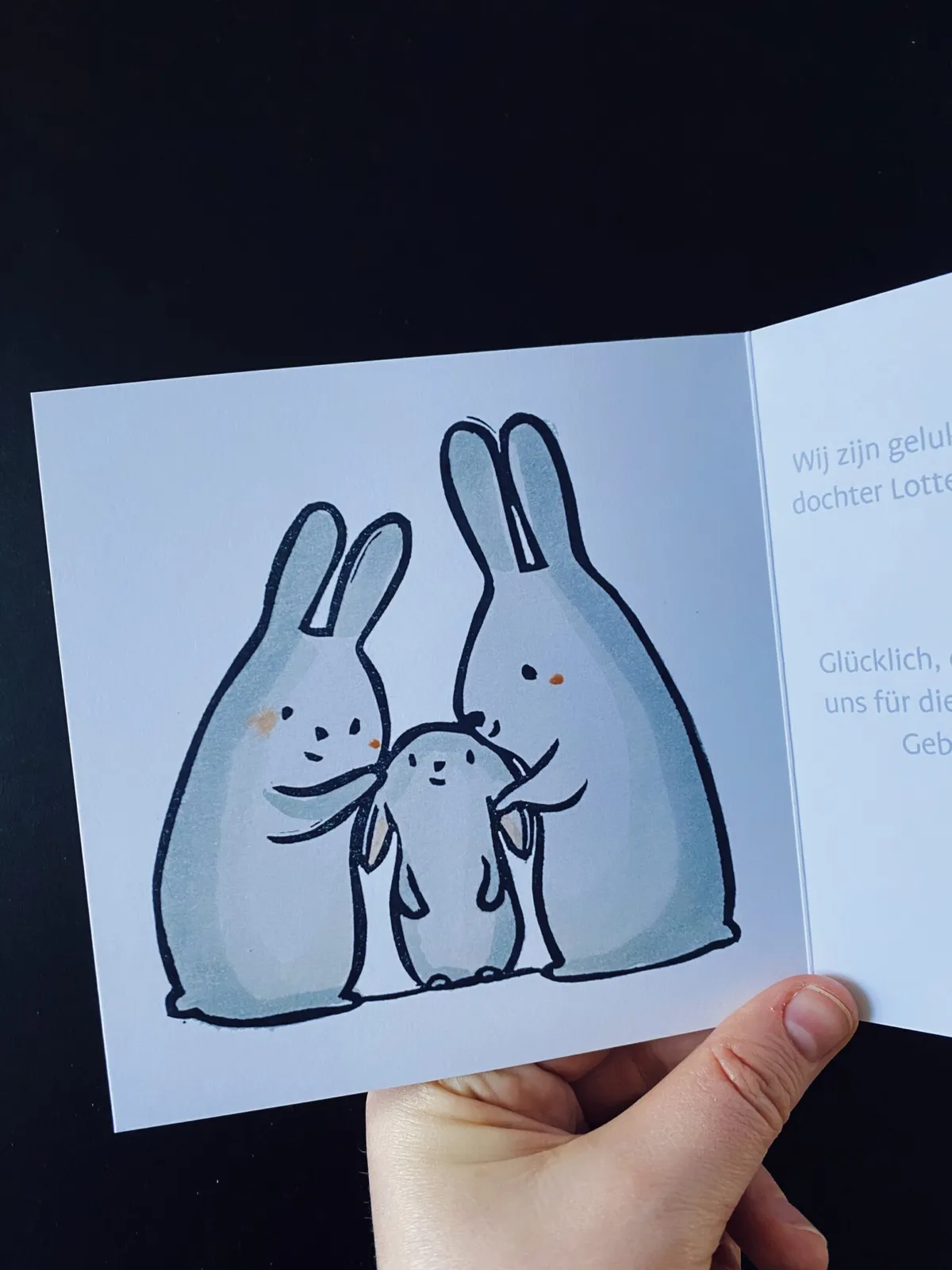 So, we decided to put a photo of the daughter on the front, and for the inside, I made a stamp... a family of rabbits! I drew the outline and colored it in with Ecoline. A nice mix of a little bit of dad and a little bit of mom!
