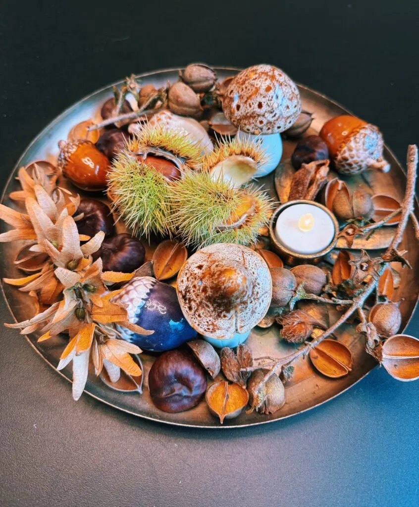 This is a fun project that I really enjoy doing with the daughter every year. When leaves start to fall, we begin to collect them. On our walks we pick up acorns, chestnuts and pine cones. And all of our autumn treasures are put on a plate on the dining table. A candle on it and we immediately have a cozy atmosphere on the table!