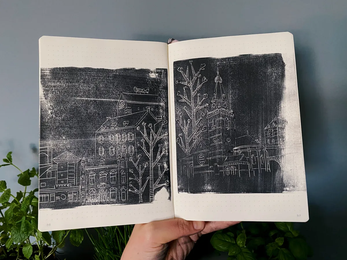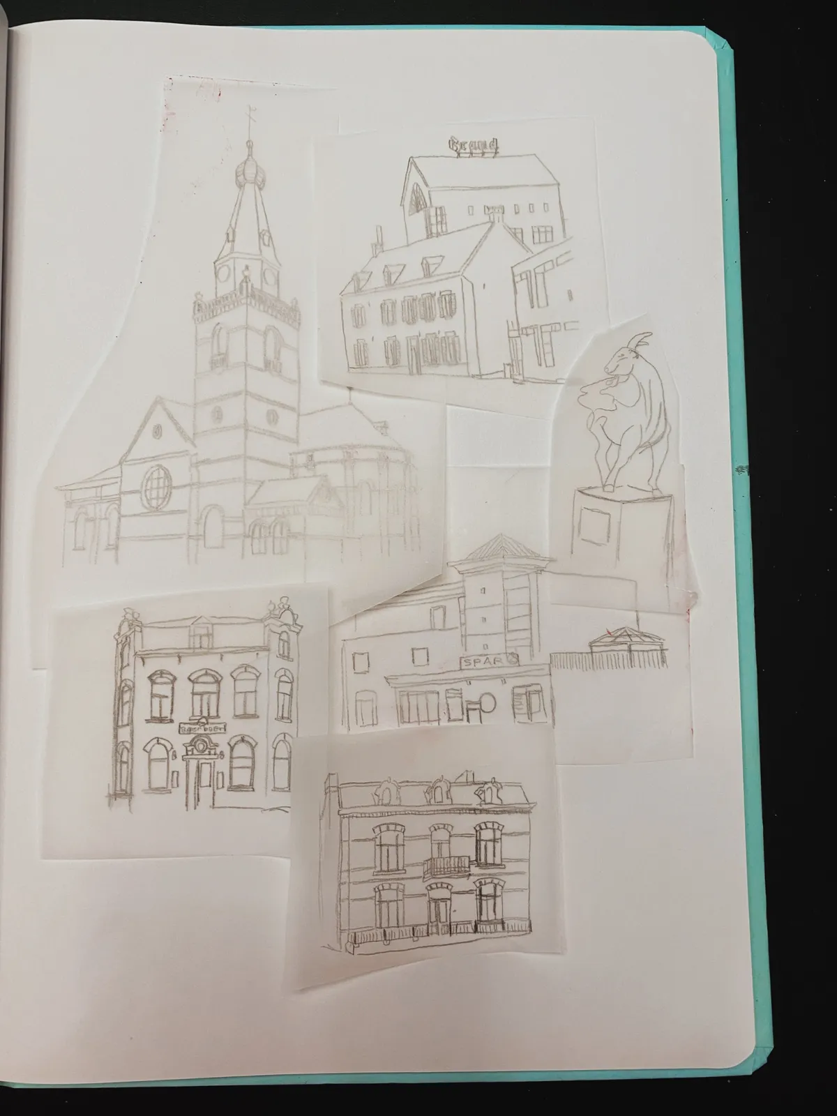 After that I made some sketches. When I'm happy with how the sketches turned out, I draw everything on transparant paper. I cut all the buildings out and make a composition.